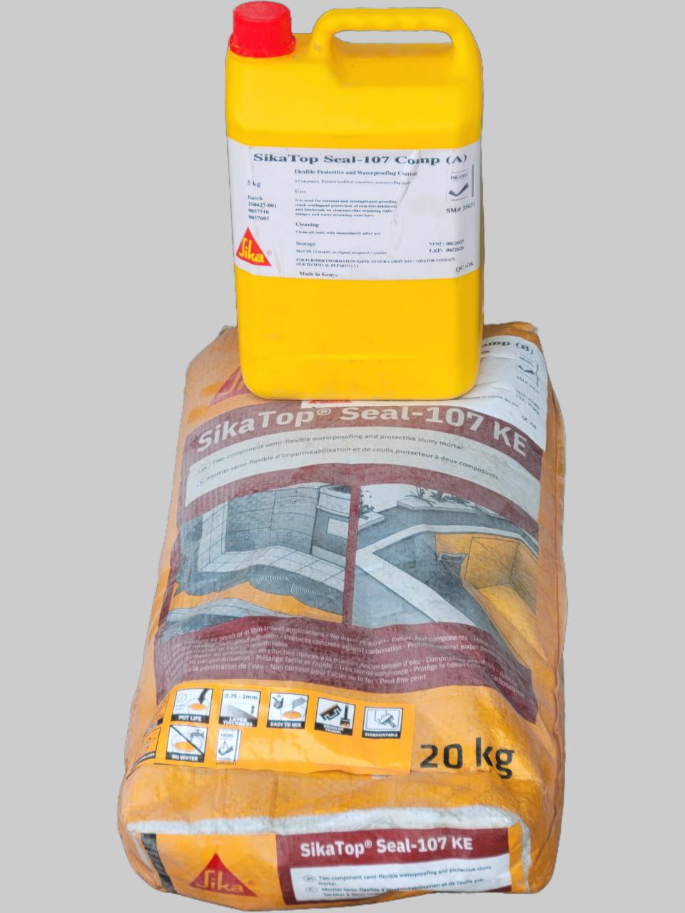 SikaTop® Seal-107 KE is a two part polymer modified cementitious waterproof mortar slurry comprising of a liquid polymer and a cement-based mix incorporating special admixtures. It is slightly flexible (semi-rigid) to tolerate fine cracks and suitable in both interior and exterior applications.